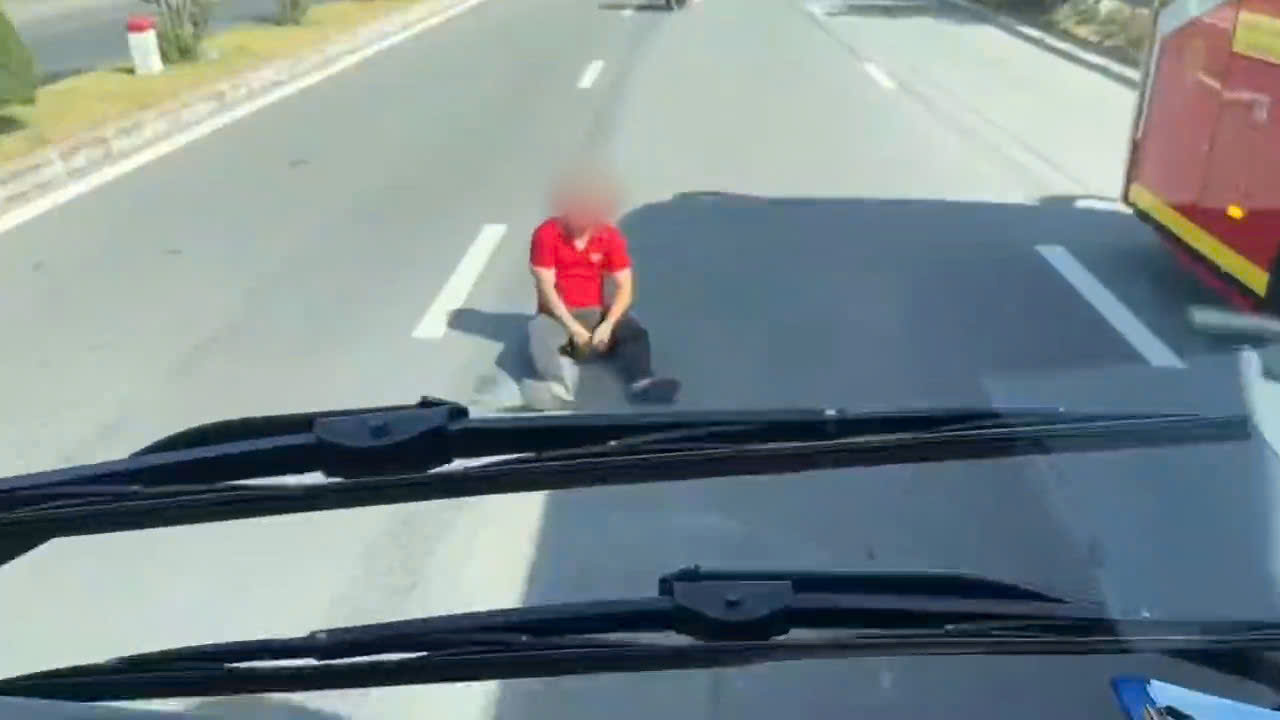 Để ngăn xe khách này di chuyển, người đàn ông ngồi luôn ra giữa đường. Khi xe khách dừng hẳn thì người này đứng dậy tiến đến chỉ trỏ.
