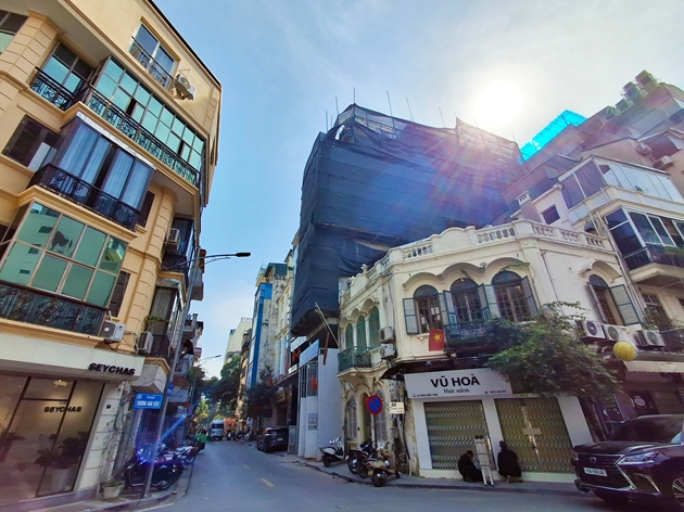 Cụ thể, trên tuyến phố Trần Quốc Toản, công trình địa chỉ số 41 đang được đầu tư thi công xây dựng với quy mô, chiều cao khoảng 7 tầng, trong đó tầng trên cùng là tầng lửng; mật độ xây dựng gần như toàn bộ diện tích khi công trình không có khoảng cách tối thiểu và cần thiết với các ngôi nhà liền kề.