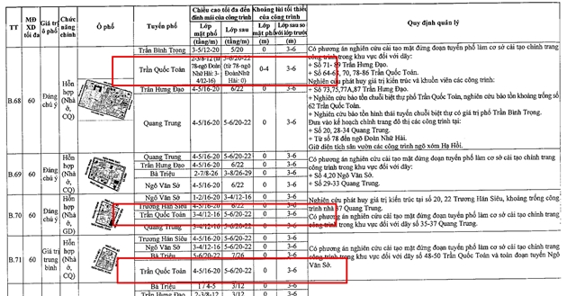 Cụ thể như, tuyến phố cũ Trần Quốc Toản được quy định chi tiết như sau: có ô phố tuyến phố Trần Quốc Toản được xây dựng công trình nhà ở riêng lẻ với chiều cao lớp mặt phố từ 2-3 tầng (tương đương từ 8-12m), lớp mặt sau từ 5-6 tầng (tương đương từ 20-22m); khoảng lùi tối thiểu công trình lớp mặt phố 0-4m, lớp sau so với lớp mặt trước từ 3-6m; mật độ xây dựng tối đa 60%.