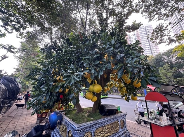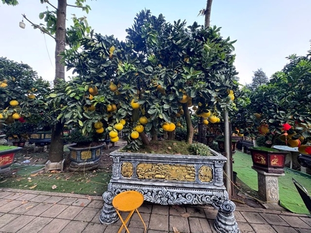 2 chậu bưởi này được nhà vườn phía Bắc săn lùng và đưa về chăm sóc từ tháng 3-2025, trải qua gần một năm nuôi dưỡng kỳ công mới đạt độ sung sức hiện tại. Mỗi chậu được ghép từ 4 gốc bưởi lớn để tạo tán rộng và hình dáng cân đối.