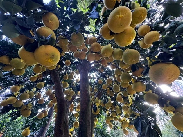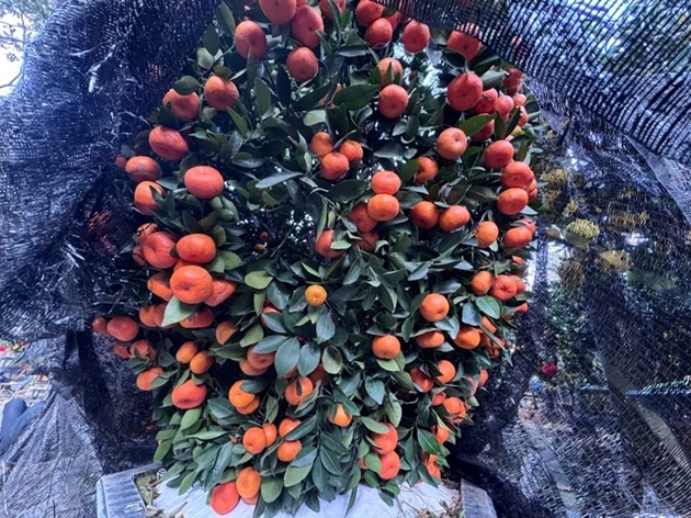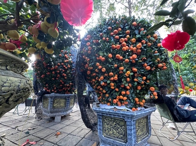 Bên cạnh bưởi Diễn, vườn kiểng này còn gây ấn tượng với cặp quýt chu sa từ Hưng Yên. Cây cao gần 4 m với hàng ngàn trái chín mọng, màu cam đỏ rực rỡ bắt mắt. Do cây thu hút đông đảo người dân đến chụp ảnh, chủ vườn phải dùng lưới nhựa trùm kín từ ngọn xuống gốc để bảo vệ, tránh tình trạng gãy cành hay rụng trái.