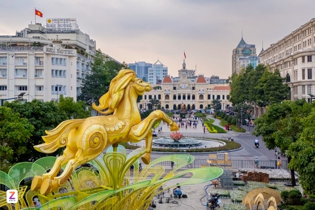 Càng cận Tết Bính Ngọ 2026, "đường đua" linh vật ngựa giữa các tỉnh, thành càng trở nên sôi động. Tại TP.HCM, đại cảnh linh vật ở phố đi bộ Nguyễn Huệ tiếp tục giữ vai trò điểm nhấn của mùa xuân phía Nam. Mô hình ngựa lấy cảm hứng từ hình tượng Thánh Gióng cưỡi ngựa bay về trời, được đặt ở vị trí trung tâm, mang thông điệp về tinh thần bứt phá và khát vọng vươn lên. Tượng cao 11 m (tính cả giá đỡ), có thể cử động đầu và chân. Ảnh: Khương Nguyễn.