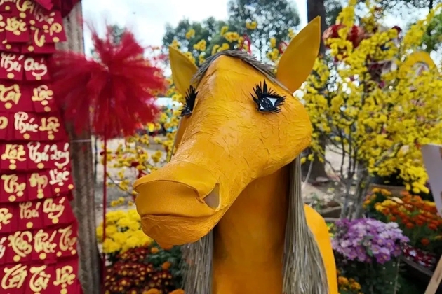 Tại Đồng Tháp, tác phẩm ngựa "nối mi, tóc bạch kim" được nhiều người chia sẻ bởi tạo hình ngộ nghĩnh. Đây là sản phẩm do giáo viên và học sinh tại phường Mỹ Phong thực hiện nhằm hưởng ứng Hội thi tiểu cảnh mừng xuân do địa phương tổ chức. Sau khi tượng lan truyền trên mạng xã hội, địa phương buộc thu hồi và chỉnh sửa để phù hợp hơn về mặt thẩm mỹ, bảo đảm ý nghĩa giáo dục, tuyên truyền và không khí vui xuân. Ảnh: