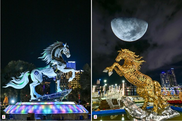 Đà Nẵng nổi lên như một trong những "điểm nóng" sáng tạo linh vật ngựa dịp Bính Ngọ 2026 với bộ đôi tác phẩm mang tên "Kim Mã Hợp Nhất" và "Kim Mã 4.0". Trong đó, linh vật ngựa công nghệ đặt tại khu vực phía Nam cầu Rồng, được thiết kế theo phong cách hiện đại với đường nét gọn gàng, khỏe khoắn, cao hơn 4 m, tượng trưng cho hình ảnh Đà Nẵng của tương lai, năng động, sáng tạo và bứt phá. Ảnh: Fan Mẫn.