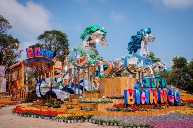 Bên cạnh "Xích mã Thăng Long" là "Song mã tương phùng". Cặp ngựa kéo xe hoa được thi công trên khung thép chắc chắn, xung quanh là cụm hoa nhiều màu sắc. Ảnh: Lê Tuấn/Thổ Địa Phú Yên.