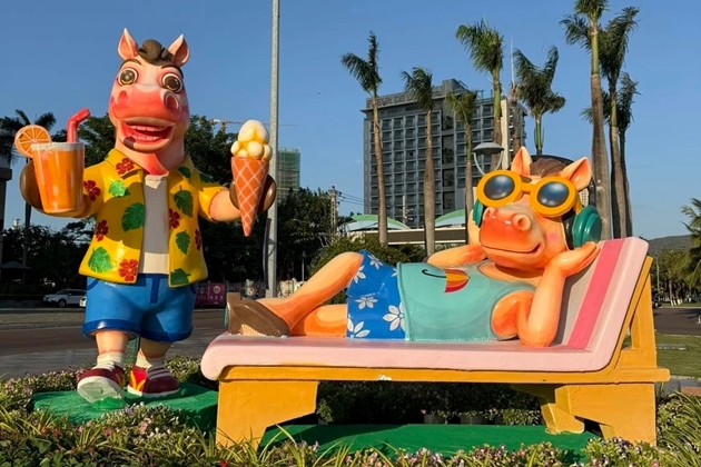 Trước đó, cụm ngựa "thư giãn", diện trang phục đi biển tại Quy Nhơn cũng thu hút sự chú ý từ người dân. Việc lựa chọn phong cách dạo biển cho linh vật được xem là cách bám sát đặc trưng của Quy Nhơn - điểm đến du lịch biển đang được định vị là nơi thân thiện, trẻ trung và giàu trải nghiệm. Ảnh: Lê Văn Thuật.