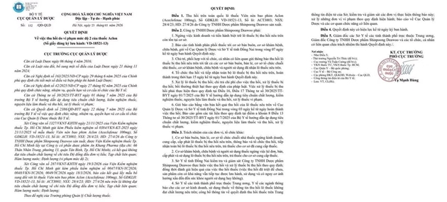 Đối với đơn vị sản xuất, Cục Quản lý Dược yêu cầu Công ty TNHH Dược phẩm Shinpoong Daewoo ngừng ngay việc kinh doanh, tiến hành biệt trữ lô thuốc bị thu hồi nêu trên còn tồn tại cơ sở; Báo cáo tình hình phân phối thuốc tới cơ sở bán buôn, cơ sở khám bệnh, chữa bệnh, gửi về Cục Quản lý Dược và Sở Y tế tỉnh Đồng Nai trong vòng 07 ngày kể từ ngày ban hành Quyết định này; Chủ trì, phối hợp với tổ chức, cá nhân có liên quan gửi thông báo thu hồi lô thuốc bị thu hồi nêu trên tới tất cả các cơ sở bán buôn, bán lẻ, cơ sở tổ chức chuỗi nhà thuốc, cơ sở khám bệnh, chữa bệnh và người sử dụng đã nhận lô thuốc nêu trên; Tổ chức thu hồi và tiếp nhận toàn bộ lô thuốc bị thu hồi nêu trên, hoàn thành trong thời hạn 15 ngày kể từ ngày ban hành Quyết định; Xử lý lô thuốc bị thu hồi; chi trả chi phí cho việc thu hồi, xử lý thuốc bị thu hồi; bồi thường thiệt hại theo quy định của pháp luật; Gửi báo cáo bằng văn bản kết quả thu hồi của lô thuốc nêu trên về Cục Quản lý Dược và Sở Y tế tỉnh Đồng Nai trong vòng 03 ngày kể từ ngày hoàn thành việc thu hồi...