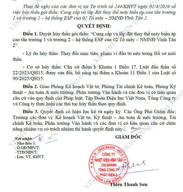 Công ty nhiệt điện Vĩnh Tân vừa thông báo hủy thầu gói “Cung cấp và lắp đặt thay thế máy biến áp cao tần trường 1 và trường 2 - hệ thống ESP của 02 Tổ máy - NMNĐ Vĩnh Tân 2”, với tổng dự toán hơn 113 tỷ đồng.