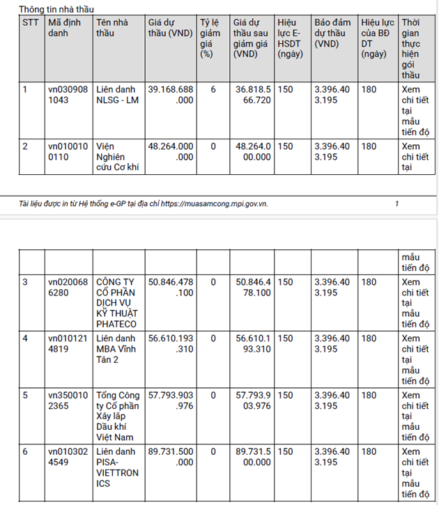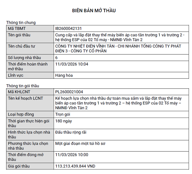 Trước đó, ngày 12/2/2026, Công ty nhiệt điện Vĩnh Tân phát hành HSMT gói thầu số IB2600042131 “Cung cấp và lắp đặt thay thế máy biến áp cao tần trường 1 và trường 2 - hệ thống ESP của 02 Tổ máy - NMNĐ Vĩnh Tân 2”, với tổng giá dự toán gói thầu 113.213.439.844 VNĐ. Ngày 11/3/2026, Công ty nhiệt điện Vĩnh Tân mở thầu với 06 nhà thầu tham dự, trong đó nhà thầu chào giá thấp nhất là Liên danh NLSG - LM với giá dự thầu sau giảm giá là 36.818.566.720 VNĐ.