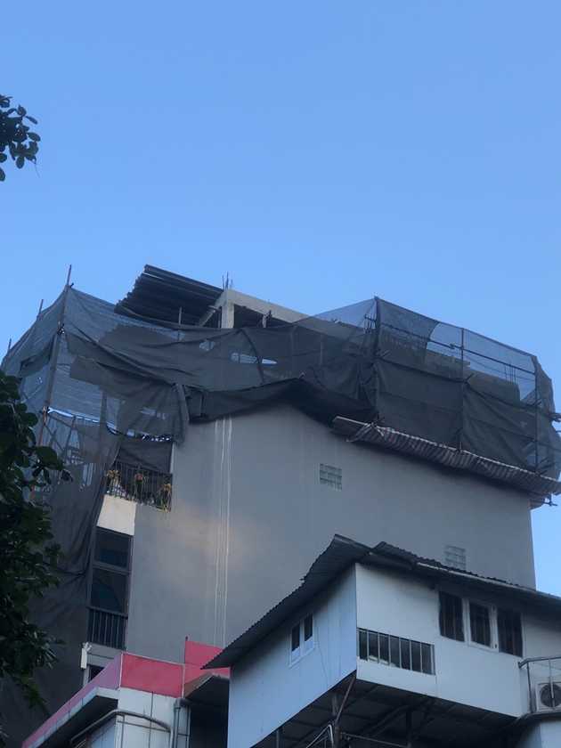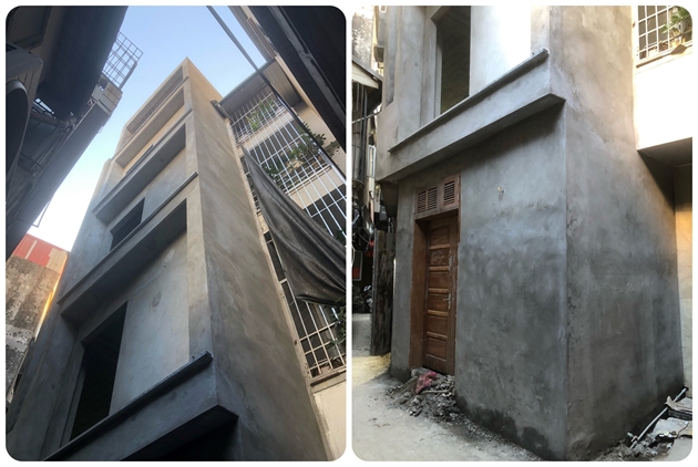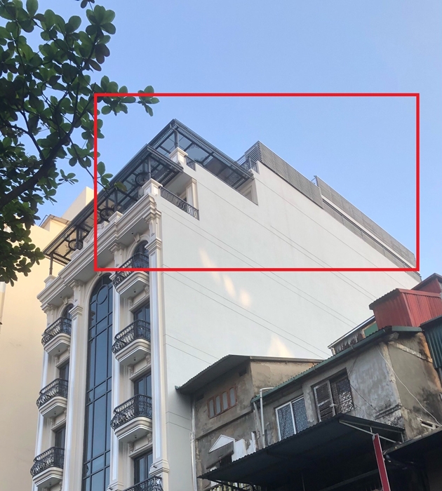 Ngôi nhà đang được chủ đầu tư xây dựng với quy mô khoảng 7 tầng có tầng hầm + tầng lửng + tầng tum, dễ dàng quan sát từ tầng 2 trở lên có dấu hiệu được thay đổi thiết kế phòng đua ra ngoài không gian chung của ngõ khoảng 1m khoảng không lấn chiếm lên tới hơn 100% diện tích, phần mái được dựng bằng khung sắt thép kiên cố, bằng 2/3 sàn mái dưới có dấu hiệu lấn chiếm khoảng không, gây mất an toàn kết cấu, ảnh hưởng đến các hộ liền kề và phá vỡ cảnh quan kiến trúc chung, rất cần được kiểm tra.
