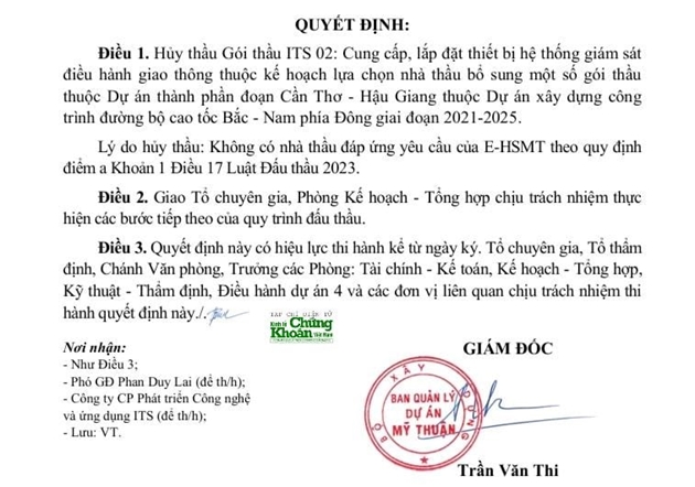 Trong cùng ngày 17/4, ông Trần Văn Thi, Giám đốc Ban QLDA Mỹ Thuận (Bộ Xây dựng), đã ký liên tiếp hai quyết định hủy thầu đối với các gói ITS 02 thuộc hai dự án thành phần cao tốc Bắc - Nam nêu trên.