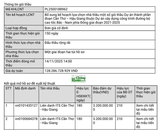 Tại gói thầu thuộc đoạn Hậu Giang – Cà Mau, biên bản mở thầu ngày 30/10/2025 ghi nhận hai nhà thầu tham gia, đều dưới hình thức liên danh.