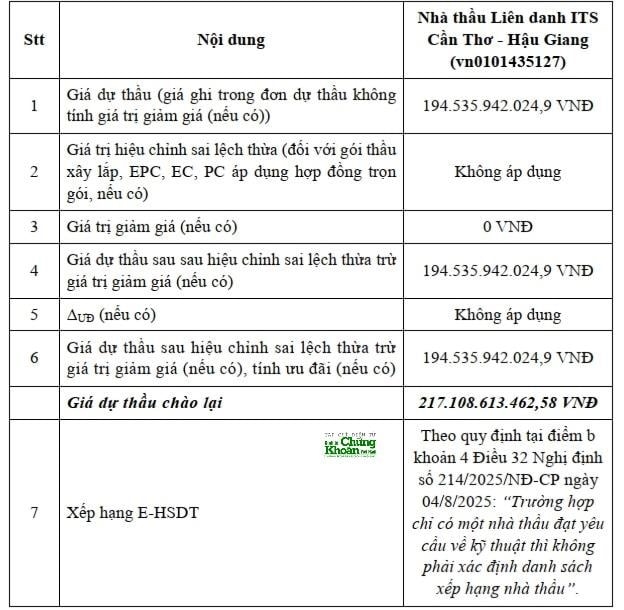 Tại gói Hậu Giang – Cà Mau, giá dự thầu ban đầu của liên danh đạt khoảng 169,7 tỷ đồng, cao hơn đáng kể so với giá gói thầu ban đầu khoảng 101,1 tỷ đồng . Khoảng chênh lệch lớn buộc chủ đầu tư phải thực hiện quy trình xử lý tình huống theo quy định, bao gồm điều chỉnh dự toán và cho phép nhà thầu chào lại giá.