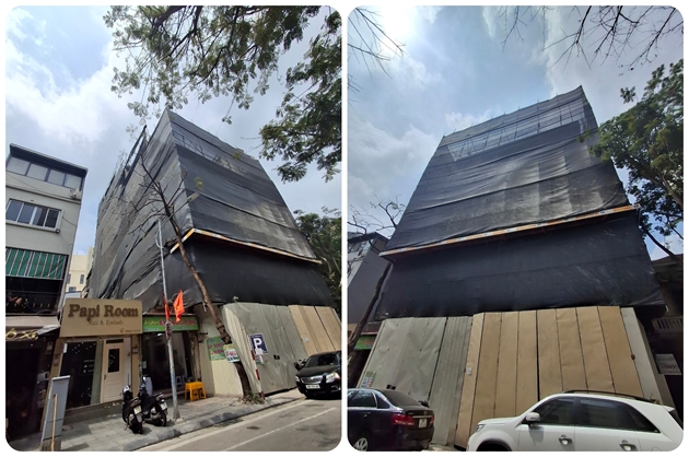 Tại một con ngõ rất nhỏ chưa đến 4m trên phố Bùi Thị Xuân, công trình nhà ở riêng lẻ số 103 đang được chủ đầu tư cải tạo xây dựng mới với mật độ lớn, quy mô khủng, phần mặt trước của 2 tầng trên cùng đang được che chắn để thay đổi thiết kế xây dựng mới.
