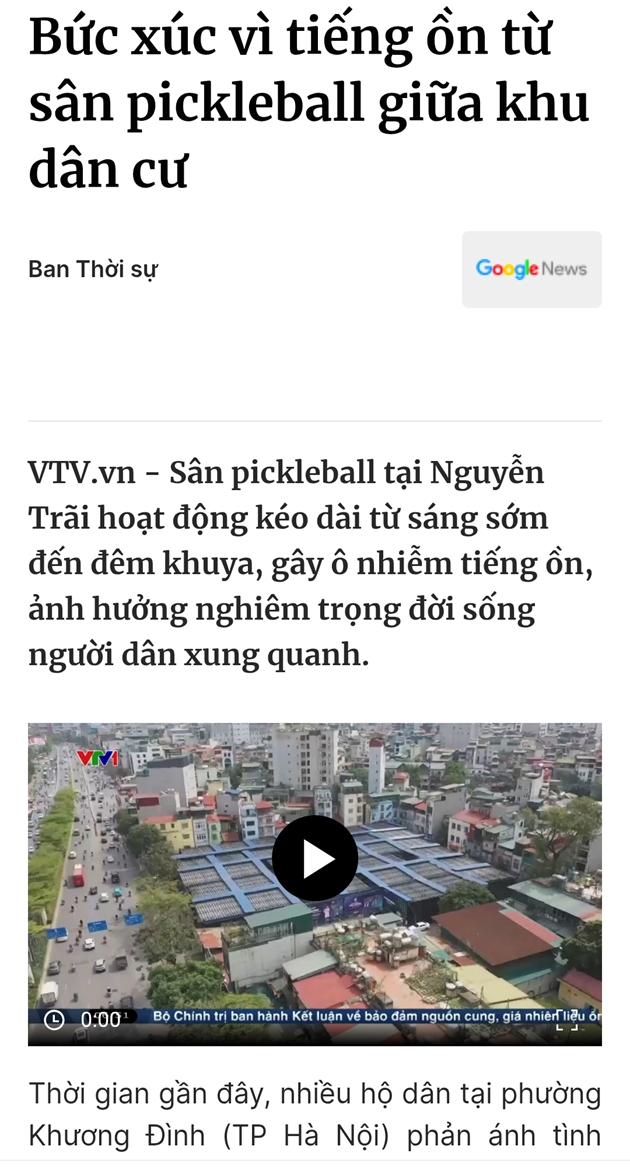 | Thông tin báo chí đưa tin về phản ánh của người dân liên quan đến sân Pickleball số 129 Nguyễn Trãi. (Nguồn VTV) |
