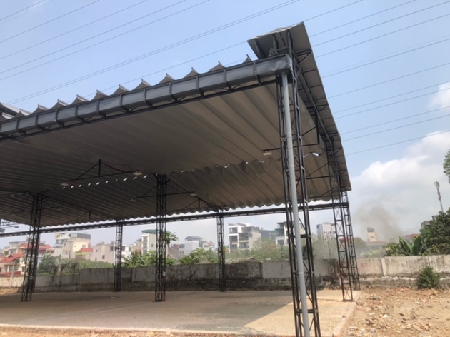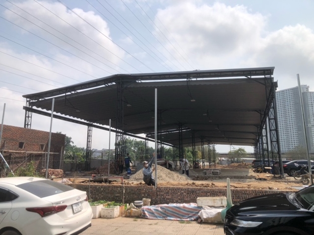 | Hệ thống mái che của sân đã được hoàn thiện và đang được nâng nền để làm mặt bằng sân |