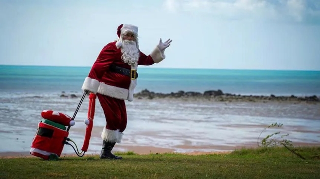 | Ông già Noel xuất hiện giữa cái nóng nhiệt đới ở Broome, miền bắc nước Úc, mang không khí Giáng sinh đến các sự kiện cộng đồng. Ảnh: ABC News |