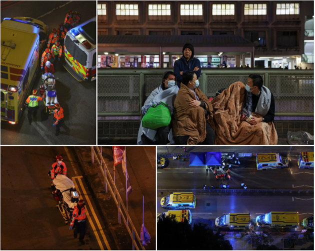 Lực lượng cứu hỏa và các nhân viên y tế đã làm việc suốt đêm, lính cứu hỏa gặp nhiều khó khăn khi tiếp cận những tầng trên cùng của các tòa nhà thuộc chung cư Wang Fuk Court do trời tối và nhiệt lượng tỏa ra từ vụ cháy quá lớn.
