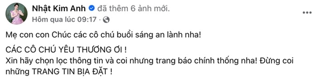 Trên trang Facebook tick xanh 7,9 triệu lượt theo dõi, Nhật Kim Anh đăng status trấn an khán giả và người tiêu dùng liên quan đến những thông tin trên mạng xã hội. Cô viết: "Mẹ con con chúc các cô chú buổi sáng an lành nha! Các cô chú yêu thương ơi! Xin hãy chọn lọc thông tin và coi những trang báo chính thống nha! Đừng coi những trang bịa đặt".