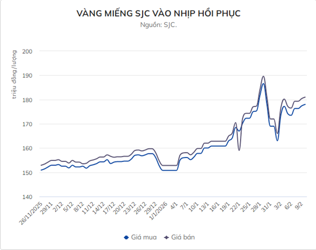 Trong phiên giao dịch sáng nay (10/2), Công ty TNHH MTV Vàng bạc đá quý Sài Gòn (SJC) niêm yết vàng miếng ở mức 178 - 181 triệu đồng/lượng (mua - bán), tăng thêm 600.000 đồng so với giá chốt phiên liền trước. Biên độ chênh lệch mua - bán tiếp tục được giữ ở mức 3 triệu đồng/lượng.