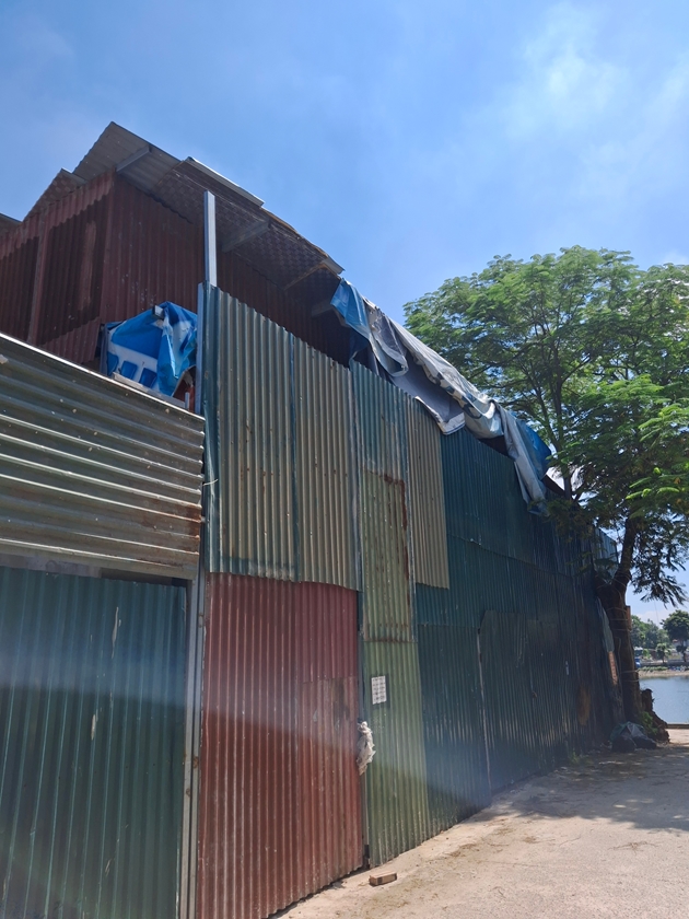 Khu vực ven bờ kè hồ Định Công nơi đây xuất hiện nhiều công trình, khu đất được quây tôn và tiến hành xây dựng |