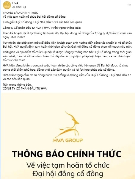 Trước đó, cuối tháng 3/2026, theo thông tin đăng tải trên fanpage Facebook có tên là HVA, đơn vị này có thông báo: “Đại hội đồng cổ đông dự kiến tổ chức ngày 31/3/2026. Tuy nhiên, do phát sinh một số điều kiện khách quan ảnh hưởng đến công tác chuẩn bị và tổ chức Đại hội, HVA quyết định tạm hoãn thời gian tổ chức Đại hội đồng cổ đông theo kế hoạch nêu trên”. Tuy nhiên, hiện nay thông báo này không còn xuất hiện trên nền tảng fanpage Facebook có tên là HVA.