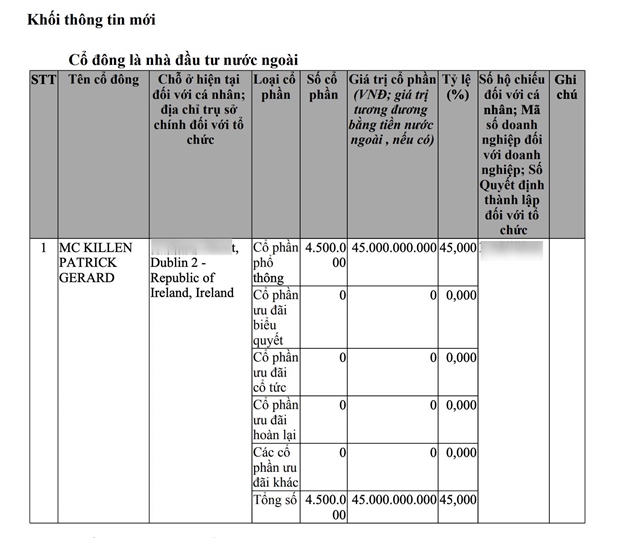 Tháng 5.2020, Đất Rồng bất ngờ xuất hiện một cổ đông nước ngoài tham gia góp vốn. Theo đó, ông MC KILLEN PATRICK GERARD, địa chỉ tại Hume Street, Dublin 2 - Republic of Ireland, góp 45 tỉ đồng vào Đất Rồng, tương đương sở hữu 45% cổ phần công ty.