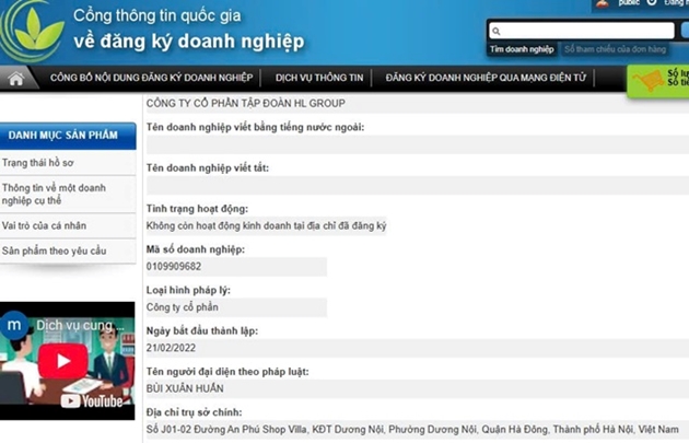Trong đó, Công ty Cổ phần Tập đoàn HL Group – được xem là liên quan trực tiếp đến lĩnh vực xe cộ – được thành lập từ tháng 2/2022, đăng ký vốn điều lệ 99,99 tỷ đồng, có trụ sở tại Khu đô thị Dương Nội (quận Hà Đông, Hà Nội). Huấn Hoa Hồng nắm 55% cổ phần và giữ chức Chủ tịch HĐQT.