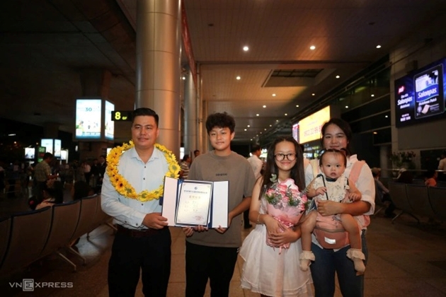 Kỳ thủ Lại Lý Huynh được vợ con chào đón khi trở về TP HCM ngày 28/9/2025. Ảnh: Đức Đồng |