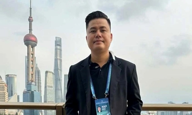 Lại Lý Huynh trong phần phỏng vấn với truyền thông Trung Quốc sau trận chung kết cờ tướng thế giới ngày 27/9/2025, ở Bến Thượng Hải. Phía xa là Tháp truyền hình Minh Châu Phương Đông, biểu tượng thành phố Thượng Hải. Ảnh: Trần Ngọc Long |