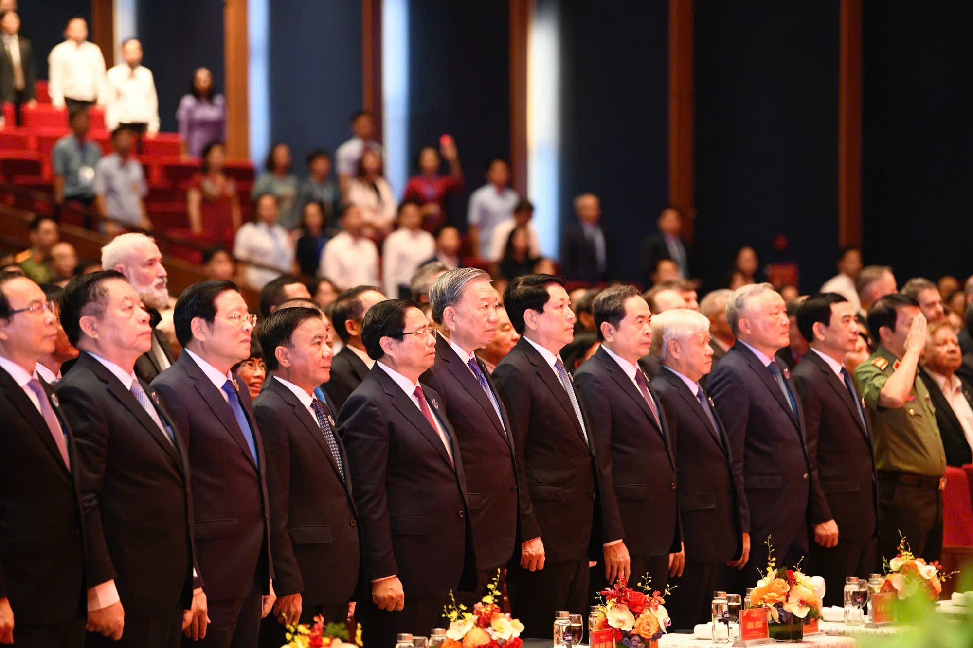 Tổng Bí thư Tô Lâm, Chủ tịch nước Lương Cường, Thủ tướng Phạm Minh Chính, Chủ tịch Quốc hội Trần Thanh Mẫn cùng các đại biểu làm lễ chào cờ