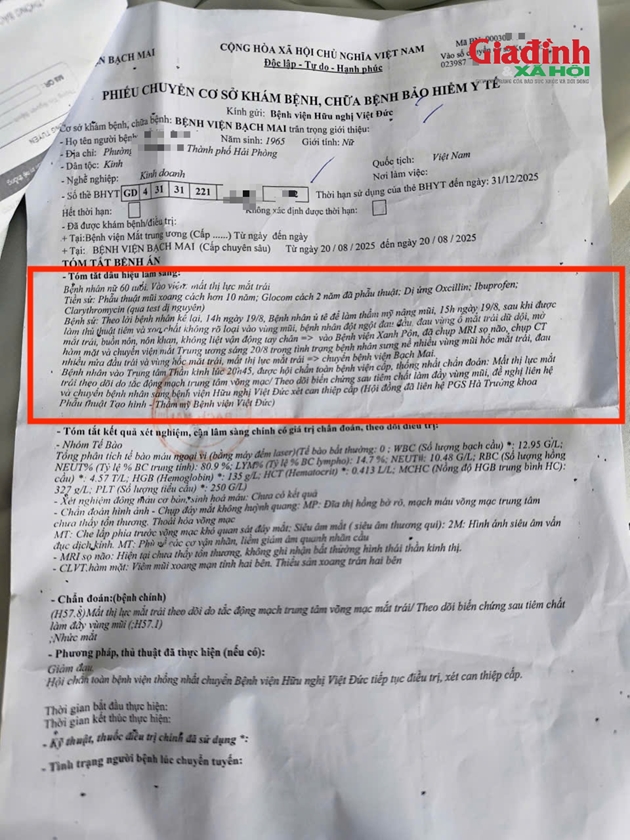 | Phiếu chuyển cơ sở khám chữa bệnh của Bệnh viện Bạch Mai gửi đến Bệnh viện Hữu nghị Việt Đức, phát hành ngày 20/8/2025 với chẩn đoán lâm sàng bệnh nhân vào viện mất thị lực mắt trái |