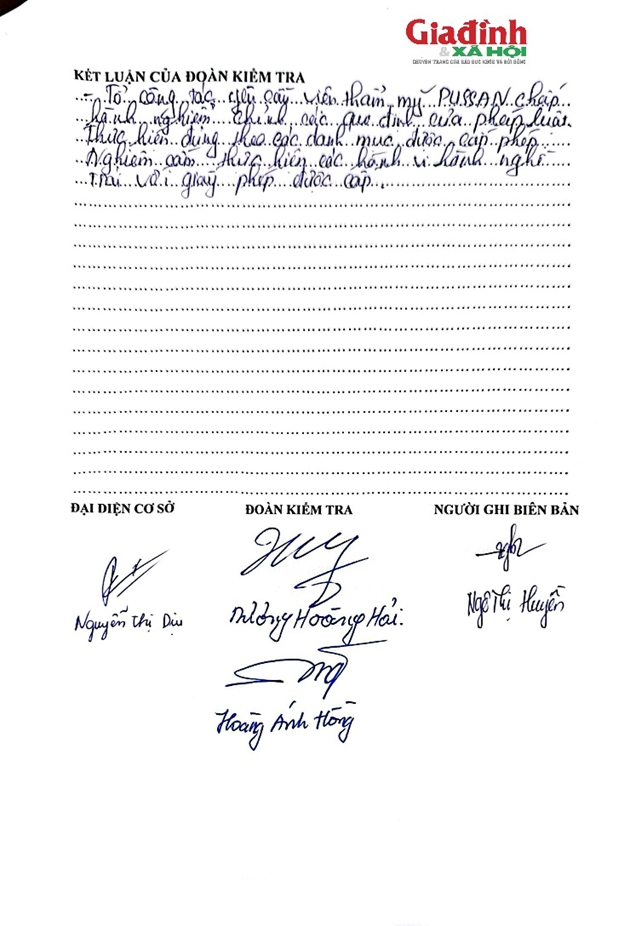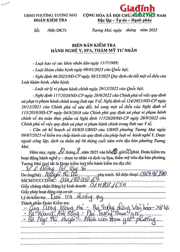 Trước đó, sau khi mô hình chính quyền hai cấp chính thức vận hành, ngày 12/8, đoàn kiểm tra của phường Tương Mai đã tiến hành kiểm tra thường quy đối với cơ sở  thẩm mỹ Pusan.