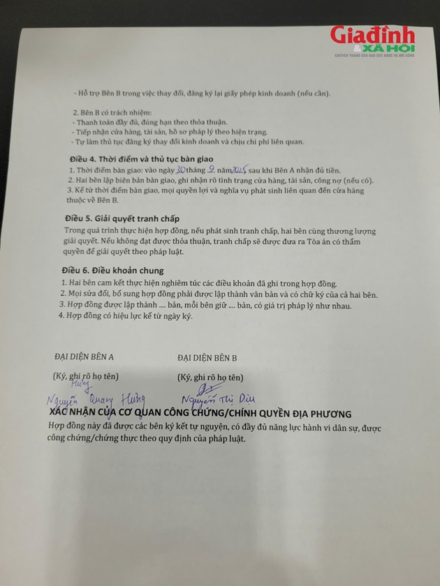 Để chứng minh việc sang nhượng, bà Dịu cung cấp một hợp đồng chuyển nhượng thương mại thể hiện nội dung chuyển giao cơ sở từ ngày 20/9. Tuy nhiên, hợp đồng chỉ là bản viết tay sơ sài, không có chứng thực, công chứng để xác minh tính pháp lý.