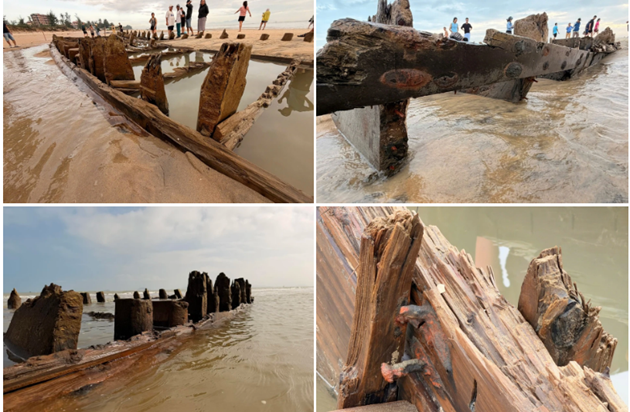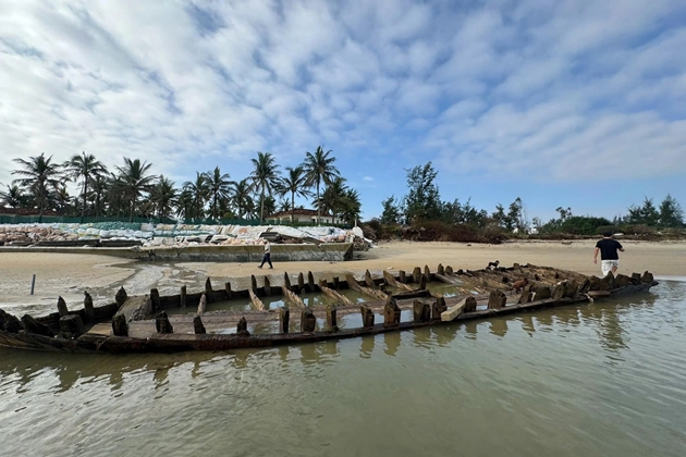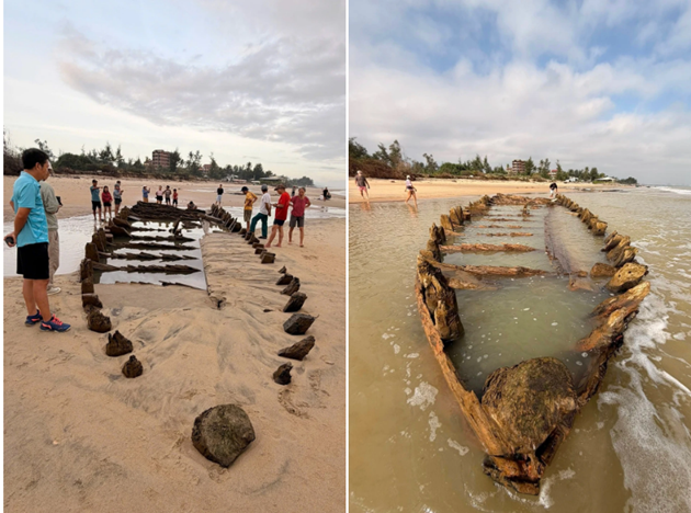 Trao đổi với Tri Thức - Znews, ông Lê Quốc Việt, Chủ nhiệm Câu lạc bộ Điểm đến Xứ Quảng, cho biết sau cơn bão số 13 (Kalmaegi), sóng mạnh liên tiếp xâm thực bờ biển, cuốn trôi lớp cát phủ ở ven biển Thịnh Mỹ (phường Hội An Tây, Đà Nẵng). Sáng 8/11, phần thân con tàu cổ được gọi là Cẩm An hiện rõ khi thủy triều xuống. Ảnh: NVCC.