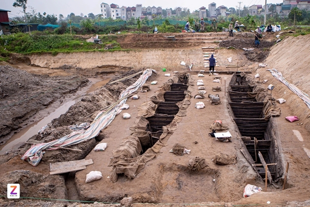 Thuyền nằm trên dòng sông Dâu cổ, một nhánh của sông Đuống chảy sát phía Tây thành Luy Lâu. Kết quả khảo cổ sau đó cho thấy phần đầu của 2 thân thuyền được đấu nối với nhau bằng tấm ván hình chữ T, dài 6,45 m, khóa chặt vào 2 thân bằng các mộng và chốt gỗ kiên cố. Ảnh: Châu Sa.