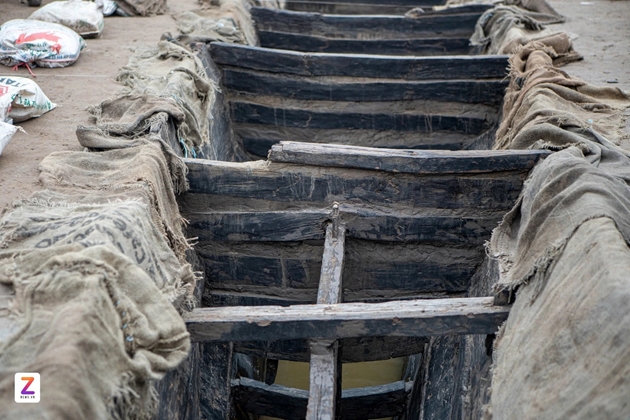 Phần đuôi thuyền là tấm ván bửng có dấu thủng và thanh gỗ chạy xuyên qua. Đây có thể là vị trí lắp bánh lái. Đáy thuyền có kết cấu độc mộc, chỗ rộng nhất 0,95 m. Thân thuyền được nối từ đáy lên đến mép trên của mạn thuyền bằng các tấm ván, tổng thể còn 7-8 lớp ván, rộng 22-34 cm, dày trung bình 4,5 cm. Ảnh: Châu Sa.