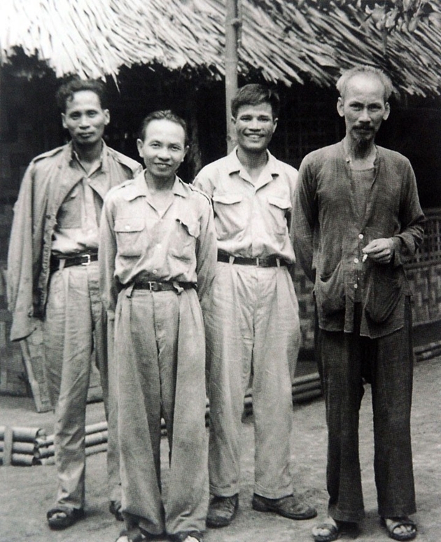 | Từ phải sang: Chủ tịch Hồ Chí Minh, Chủ nhiệm Tổng cục Chính trị Nguyễn Chí Thanh, Tổng Bí thư Trường Chinh, Phó Thủ tướng Phạm Văn Đồng tại Việt Bắc. Ảnh Tư liệu |