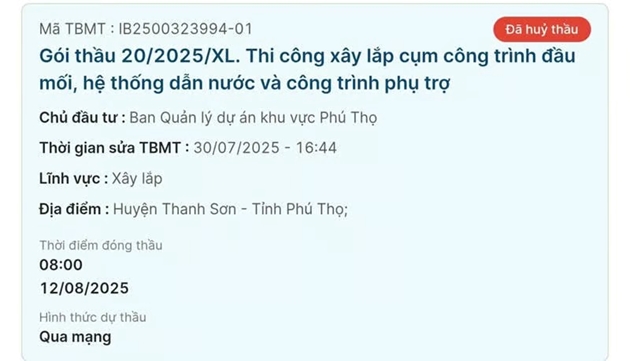 Theo thông báo từ Mạng đấu thầu Quốc gia, ngày 15/9/2025, Ban quản lý dự án khu vực Phú Thọ đã có thông báo hủy thầu gói thầu 20/2025/XL Thi công xây lắp cụm công trình đầu mối, hệ thống dẫn nước và công trình phụ trợ thuộc dự án Hồ chứa nước Thục Luyện, tỉnh Phú Thọ. Lý do hủy thầu đối với gói thầu trên là tất cả hồ sơ quan tâm, hồ sơ dự sơ tuyển, hồ sơ dự thầu, hồ sơ đề xuất không đáp ứng được các yêu cầu của hồ sơ mời quan tâm, hồ sơ mời sơ tuyển, hồ sơ mời thầu, hồ sơ yêu cầu.