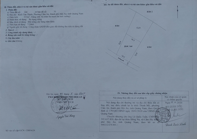 GCNQSDĐ xác lập quyền sử dụng đất của ông Tuấn tại thửa đất số 144, tờ bản đồ số 31, tổ 3, khối Thịnh Mỹ, phường Cẩm An, TP Hội An.