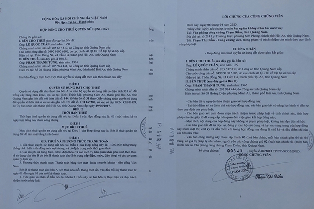 Ngày 06/4/2023, ông Tuấn đã thỏa thuận cho ông Tùng được thuê quyền sử dụng đất có DT 333m2 tại thửa đất số 144, tờ bản đồ số 31 để ươm và nhân giống dừa xiêm nhằm mục đích cải thiện kinh tế gia đình. Hợp đồng đã được Văn phòng công chứng Phạm Diểm, địa chỉ tại số 214 đường Lý Thường Kiệt, phường Sơn Phong, TP Hội An chứng nhận có số công chứng 00349, quyển số 02/2023.