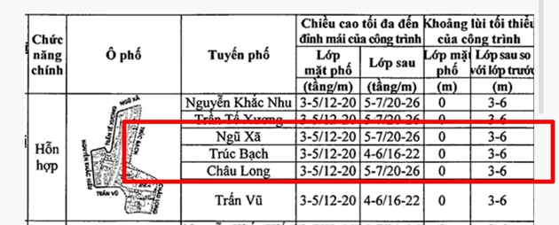 Còn về tuyến phố Trúc Bạch, công trình nhà ở riêng lẻ được quy định xây dựng mặt trước công trình có số tầng từ 3 – 5 tầng (tương đương 12 – 20 mét), mặt sau của công trình có số tầng từ 4 – 6 (tương đương 16 – 22 mét), khoảng lùi của lớp mặt sau so với lớp mặt trước từ 3 – 6 mét.