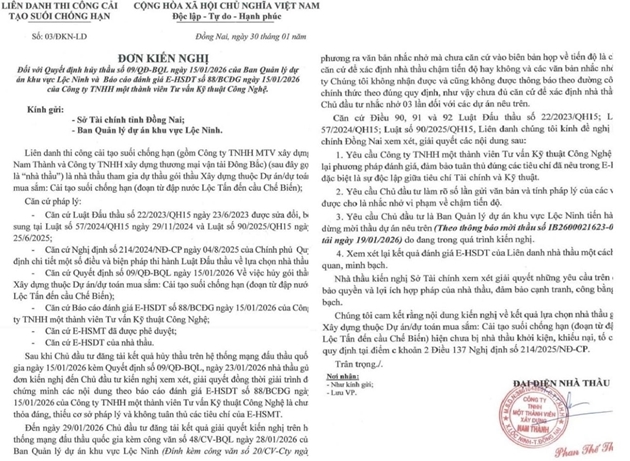 Tại Đơn kiến nghị số 01/ĐKN-LĐ ngày 23/1, Công ty Nam Thành gửi Ban QLDA Khu vực Lộc Ninh nêu nhiều nội dung khẳng định, đơn vị tư vấn đánh giá không đúng về E-HSDT của liên danh. Ngày 28/1, Ban QLDA Khu vực Lộc Ninh ban hành Văn bản số 48/CV-BQL trả lời liên danh, kiến nghị nhà thầu không có cơ sở.