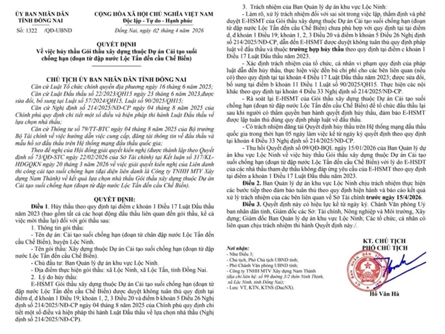 Trên cơ sở Kết luận số 317/KL-HĐGQKN, ngày 2/4, Chủ tịch UBND tỉnh Đồng Nai ban hành Quyết định 1322/QĐ-UBND hủy thầu Gói thầu xây dựng thuộc Dự án Cải tạo suối chống hạn. Chủ tịch UBND tỉnh nêu lý do: “E-HSMT Gói thầu xây dựng thuộc Dự án Cải tạo suối chống hạn (đoạn từ đập nước Lộc Tấn đến cầu Chế Biến) được duyệt không tuân thủ quy định tại điểm d, đ khoản 1 Điều 19; khoản 1, 2, 3 Điều 20 và điểm b khoản 5 Điều 26 Nghị định số 214/2025/NĐ-CP ngày 04 tháng 8 năm 2025 của Chính phủ quy định chi tiết một số điều và hiện pháp thi hành Luật Đấu thầu về lựa chọn nhà thầu (Nghị định số 214/2025/NĐ-CP)”.