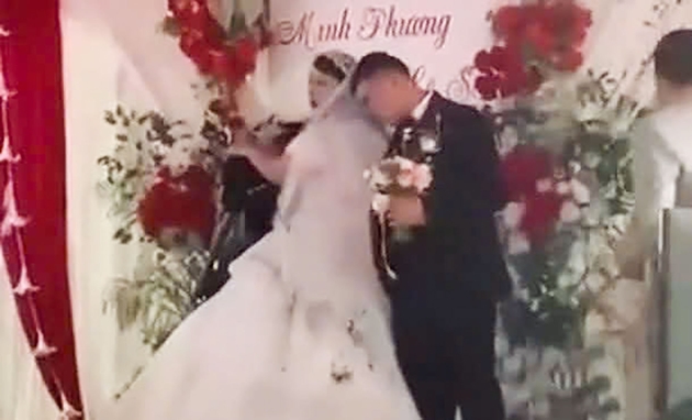 | Cô dâu, chú rể bị ném mắm tôm khi đang làm lễ cưới. Ảnh: Cắt từ clip |