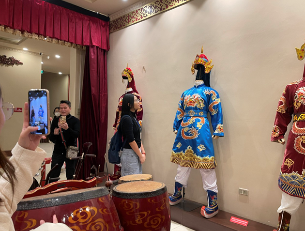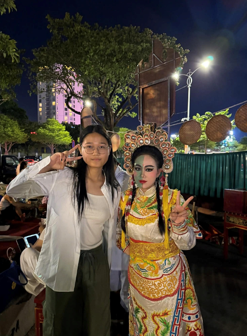 | Đặng Trần Hà An chụp ảnh cùng diễn viên Tuồng |