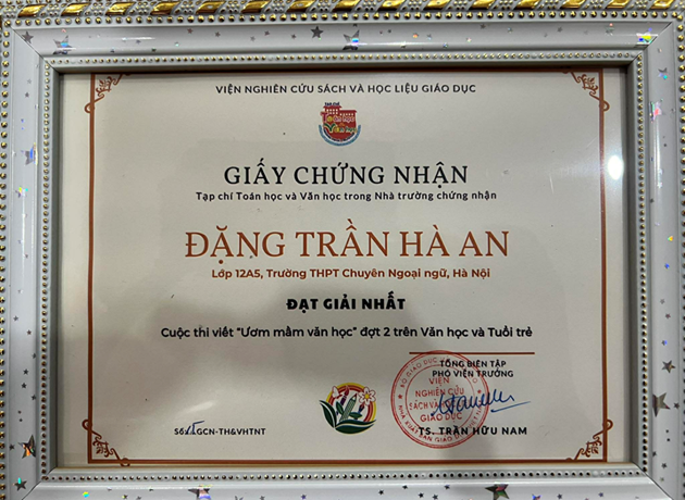 | Tác phẩm “Sau lớp áo choàng” Hà An đạt giải nhất cuộc thi “Ươm mầm văn học năm 2025” do Tạp chí Toán học và Văn học trong nhà trường tổ chức |