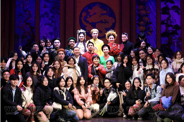 | Đặng Trần Hà An chụp ảnh lưu niệm cùng các diễn viên nhà hát Tuồng Trung ương trong đêm diễn vở “ Phương thuốc thần kỳ” |