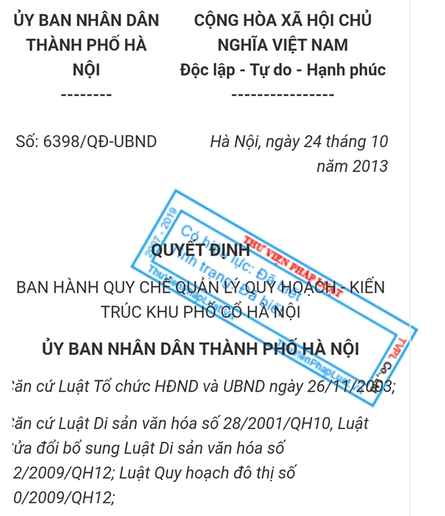 | Quyết định số 6398/QĐ-UBND ngày 24/10/2013 về việc quyết định ban hành quy chế quản lý quy hoạch kiến trúc khu phố Cổ Hà Nội |