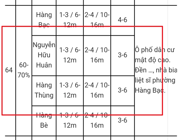 Cụ thể như, phố Hàng Thùng lớp nhà mặt phố được xây dựng từ 1-3 tầng (tương đương 6-12m ), lớp phía sau từ 2-4 tầng (tương đương 10-16m ), khoảng lùi tối thiểu của lớp sau 3-6m; mật độ xây dựng ô phố 50-65% hoặc 60-70% tùy thuộc vào từng ô phố.